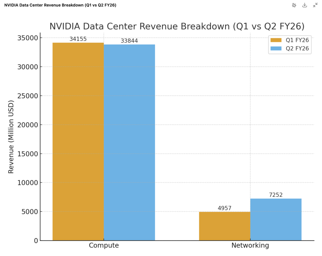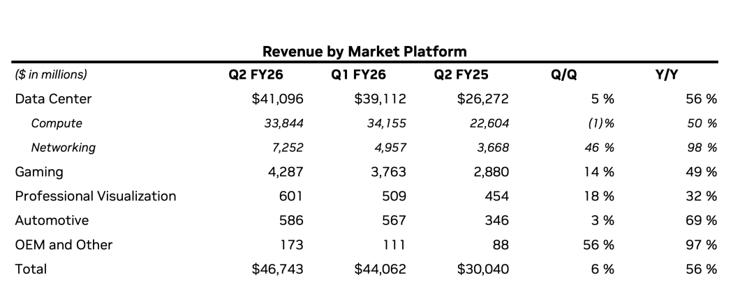 但總體來看,H20 芯片相關的收入相比第一季度仍然鋭減了約 40 億美元。這就解釋了為何計算業務在第二季度出現了環比 1% 的微幅下滑——因為它是在與一個包含了「一次性」高收入的第一季度作比較。