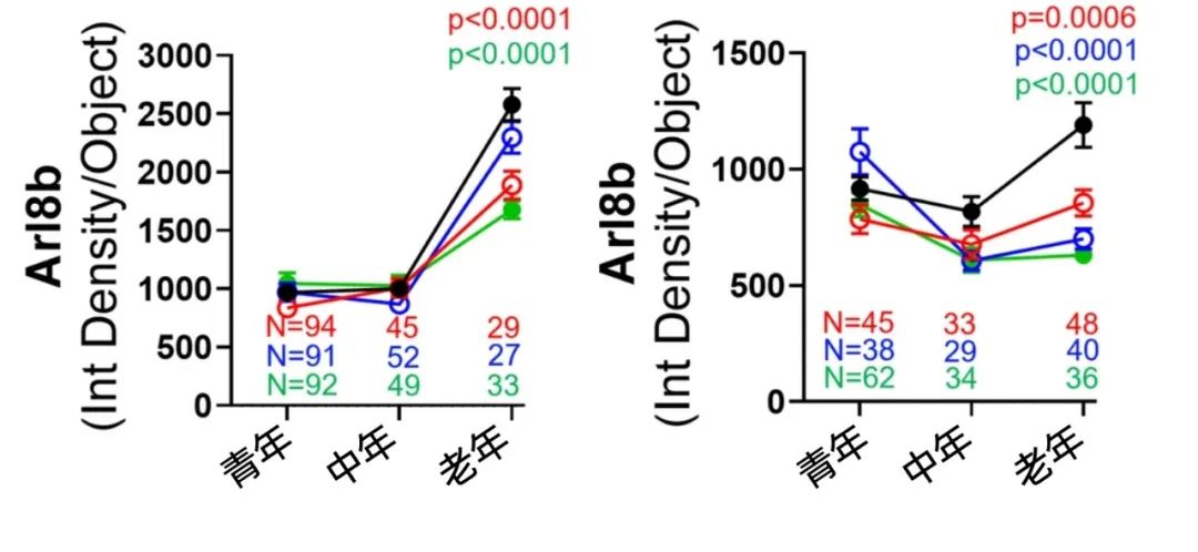 功能方面,GTP酶就是很好的衡量GTP是否正常工作的指標,科學家檢測了Rab7和Arl8b的積累情況。結果發現,老年小鼠神經元中Rab7和Arl8b大量積聚,而煙酰胺+EGCG干預後,隨着更多GTP加入工作,GTP酶也都去到了自己的崗位,而不是無所事事地堆積在一起。