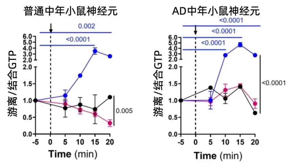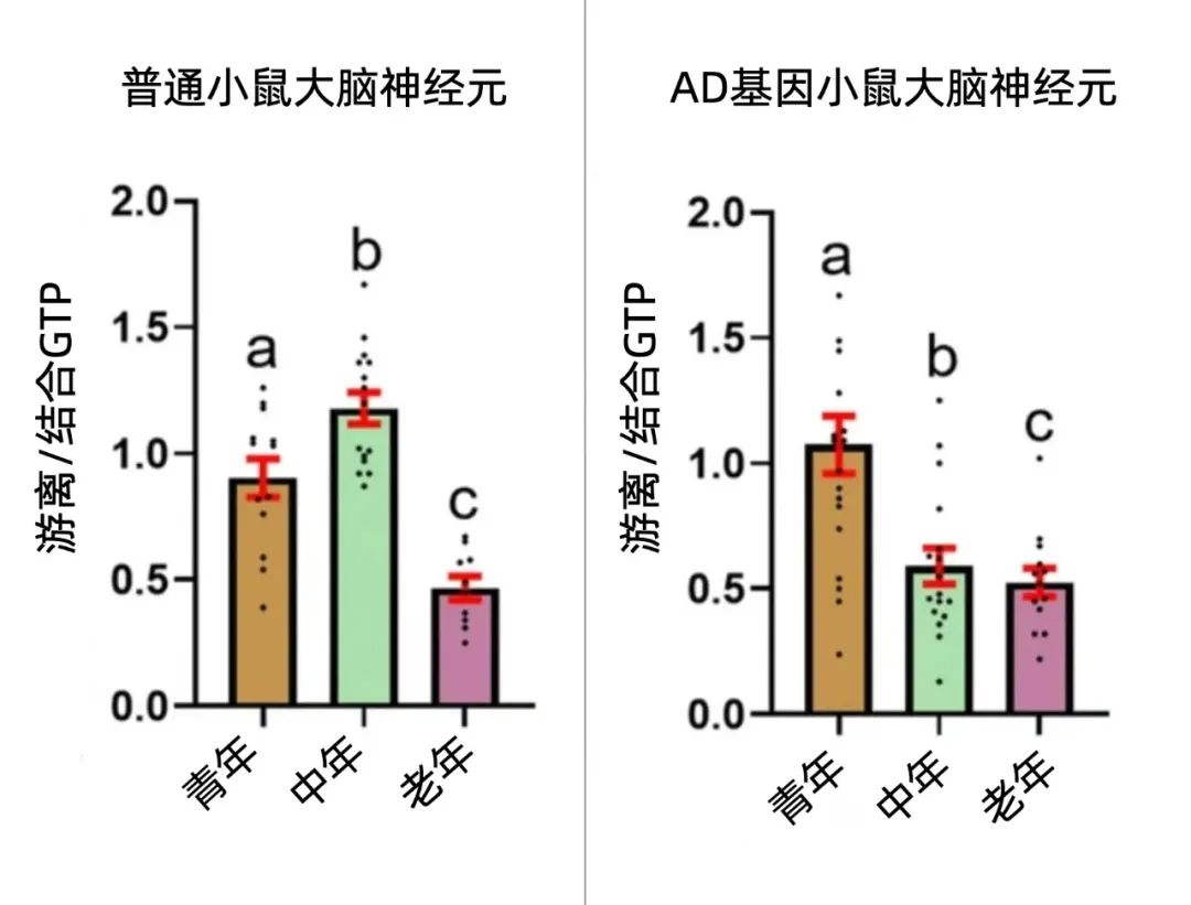 研究人員分別從年輕(2-6個月)、中年(8-11個月)和老年(17-28個月)的普通小鼠和具有AD基因的小鼠模型中分離出了大腦神經元細胞,通過熒光傳感器測量細胞中的GTP水平。不出所料,衰老會導致大腦神經元GTP的水平下降,在AD模型中更是在中年時期就顯著下降了(大約僅相當於人的四十多歲)。