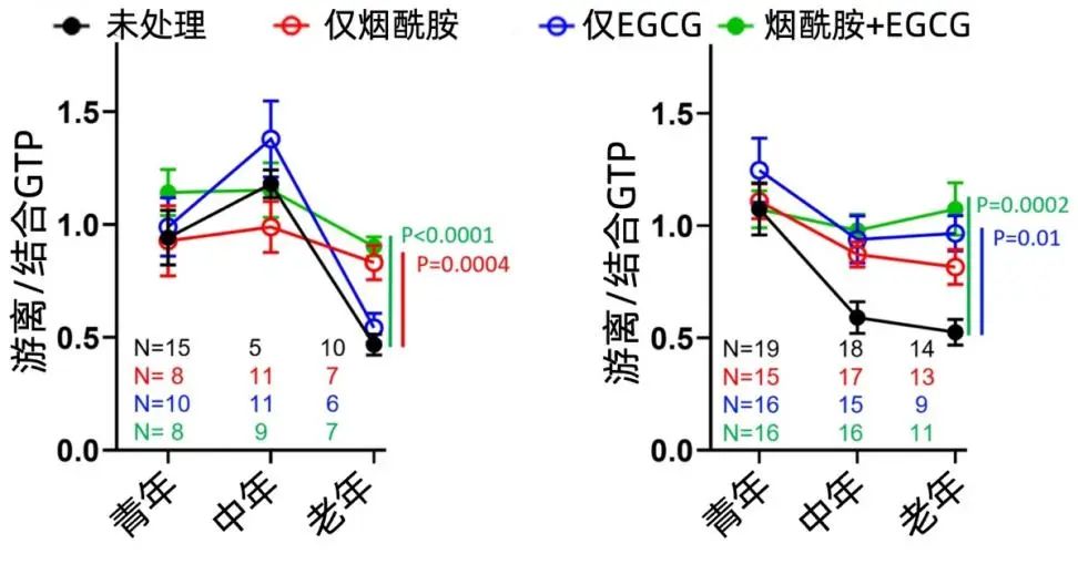 結果是樂觀的。16小時的孵育後,老年神經元的遊離GTP水平顯著上升了,而且煙酰胺+EGCG的聯合用藥得到了最為顯著的效應。在AD小鼠的神經元中效果更好:甚至能夠恢復到年輕時候的狀態。