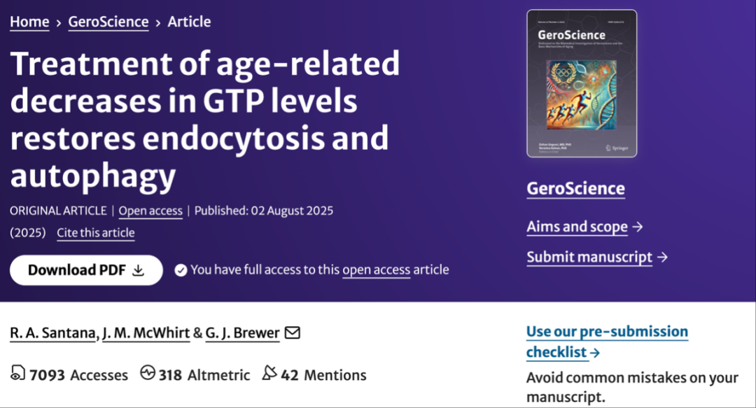 [4] SANTANA R A, MCWHIRT J M, BREWER G J. Treatment of age-related decreases in GTP levels restores endocytosis and autophagy [J]. GeroScience, 2025.