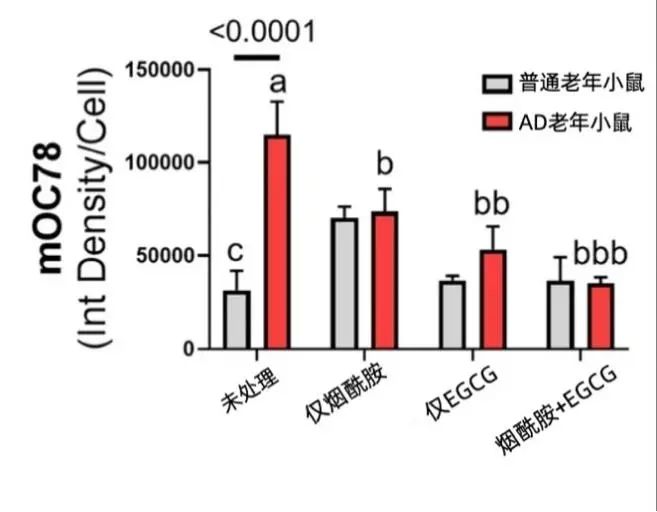 在機制裏走了一大圈,也不能忘了AD大腦中大量堆積的Aβ,如果Aβ也能得到清理,才能説明這項針對GTP的修復方案真正產生了效果。研究結果顯示,16小時的煙酰胺+EGCG聯合治療後,老年AD小鼠神經元的Aβ沉積降低到了接近普通老年小鼠的程度。