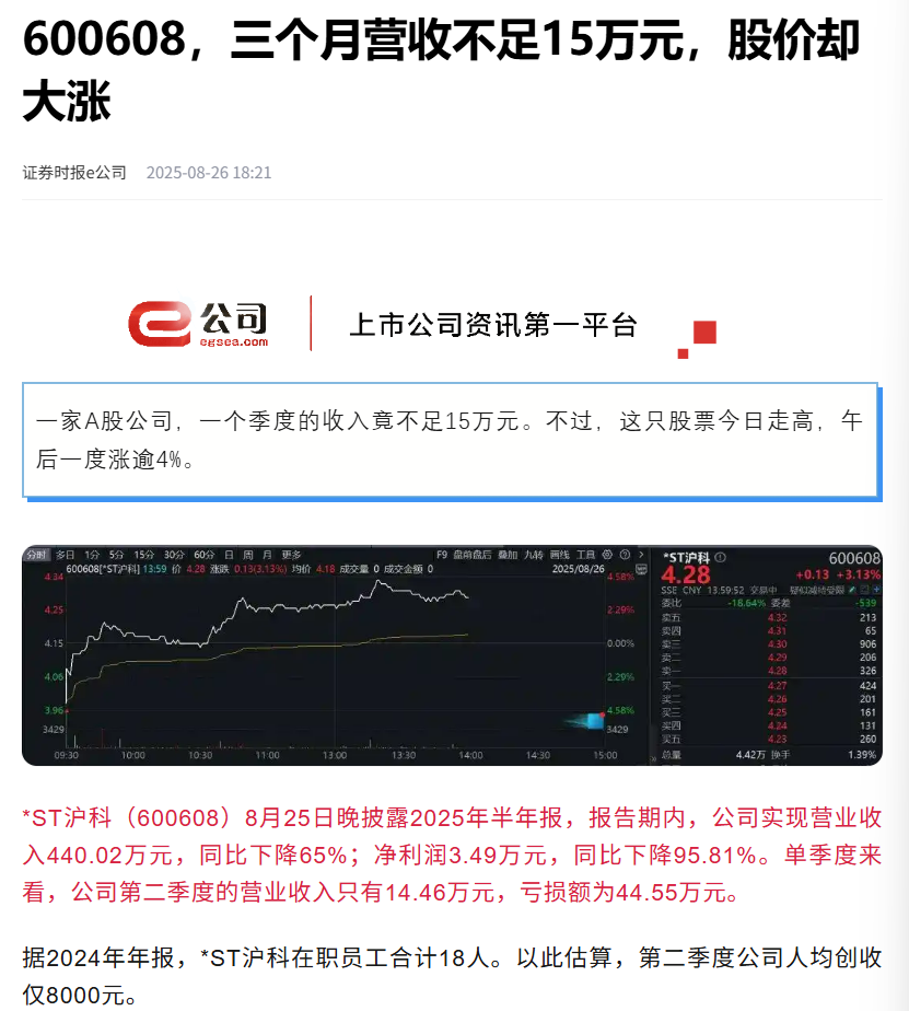 最近,有一家叫*ST滬科(SH600608)的上市公司,4-6月忙活了3個月,營收——