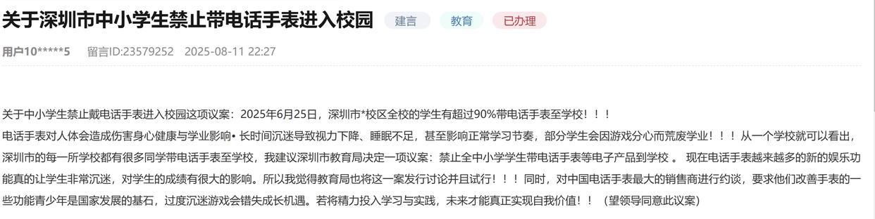 家長在留言中表示,深圳市校區全校的學生有超過 90% 帶電話手錶至學校,電話手錶對人體會造成傷害身心健康與學業影響長時間沉迷導致視力下降、睡眠不足,甚至影響正常學習節奏,部分學生會因遊戲分心而荒廢學業。建議深圳市教育局決定一項議案:禁止全中小學學生帶電話手錶等電子產品到學校 。現在電話手錶越來越多的新的娛樂功能真的讓學生非常沉迷,對學生的成績有很大的影響。同時,對中國電話手錶最大的銷售商進行約談,要求他們改善手錶的一些功能。青少年是國家發展的基石,過度沉迷遊戲會錯失成長機遇。若將精力投入學習與實踐,未來才能真正實現自我價值。