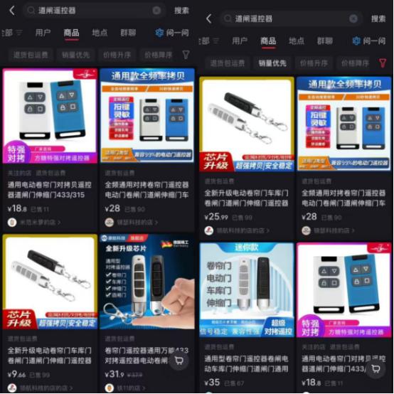 曝光之後,多家平台緊急下架,關鍵詞也被清理。但當時隔一個月,在小紅書輸入“道閘遙控器”重新檢索,看到的卻不是“擦邊筆記”不是“偽裝鏈接”,而是在小紅書商品頁面明晃晃掛着數十餘個“全頻段遙控器”標籤的真實商品頁面,還配有商品封面圖、參數説明、價格信息,完全在售狀態。