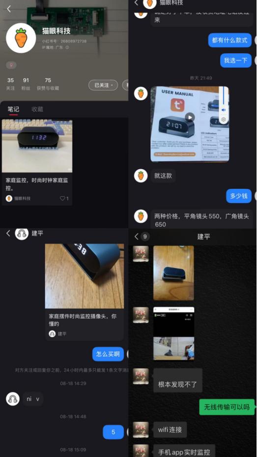 另一位名為“貓眼科技的博主則發佈一則展示鬧鐘的視頻筆記,配文是家庭監控,在小紅書私聊時該博主表示,這款鬧鐘攝像頭兩種價格,平角鏡頭550元,廣角鏡頭650元。