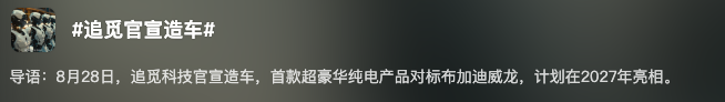 而且首款產品能對標布加迪威龍,計劃 2027 年亮相,上來就瞄準高端市場,看來是信心十足。