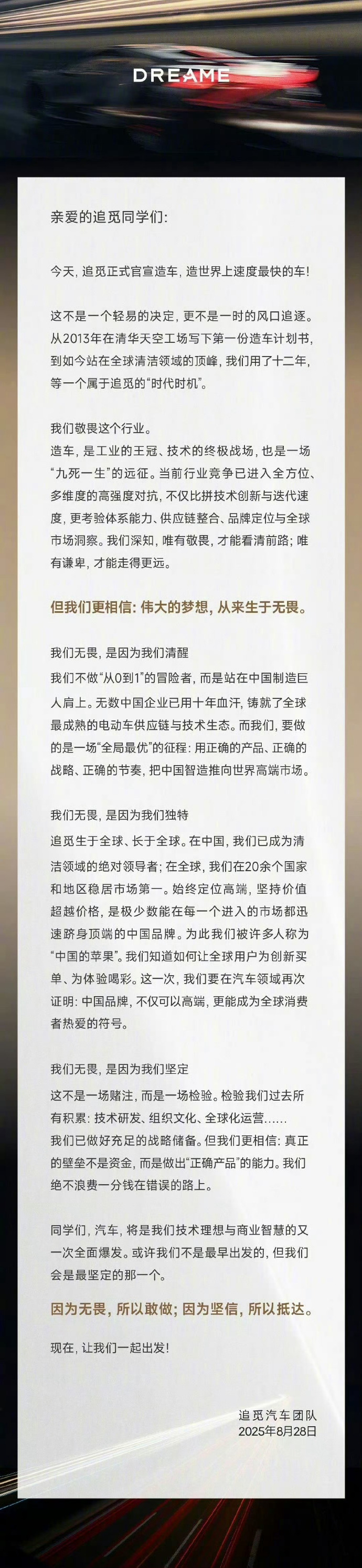成不成再説,但追覓這次造車,真不是先説出來看看反響的。