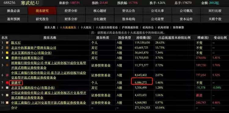 而在這場劇烈切換的洪流中,一個熟悉又神秘的名字再次被推上風口——章建平。他是寒武紀的第二大流通股東,也是這場風格輪動中最先吃到螃蟹的人。短短四個月,賬面浮盈超56億元,單日飆升13億。他不吭聲、不喊單,不直播講股,只在中報悄然露面,卻一次次踩中行情的節奏點。相比股價的高潮,更讓人着迷的是——這個“神級牛散”,到底是怎麼看穿這場AI信仰交易的?