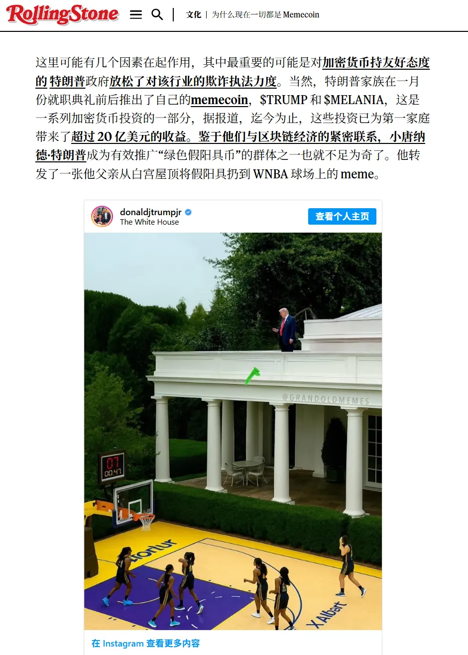 滾石雜誌前兩天出了一篇文章,抨擊現在泛濫的虛擬貨幣,並提到了特朗普的兒子轉發了扔綠屌的圖(特朗普此前發行了自己的虛擬貨幣)