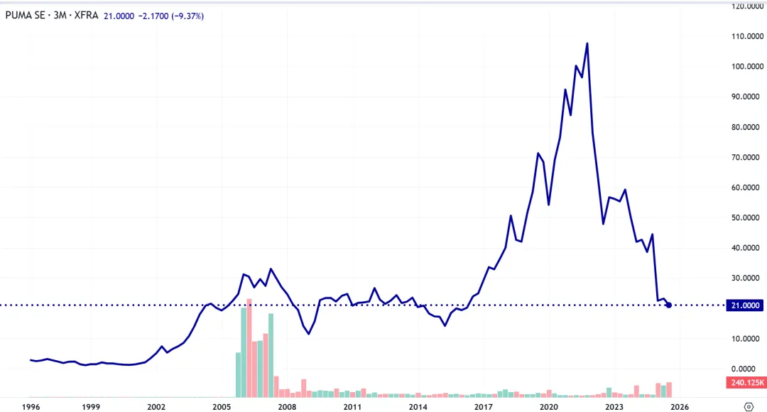 就連一些關鍵數據都像是回到10年前。就在上週,彪馬股價曾跌至17歐元,創2016年以來新低。