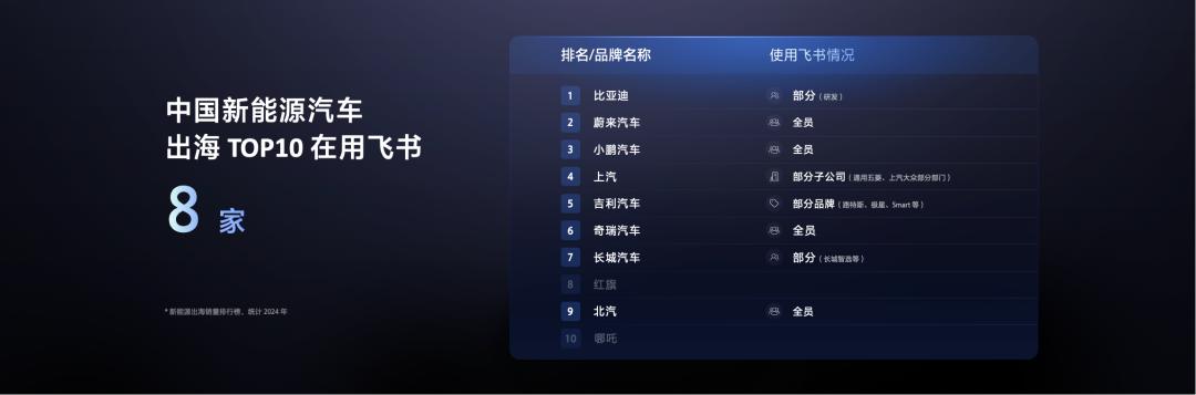林嬋在大會上公佈了一組數據,中國出海新鋭品牌出海TOP10裏有6家在用飛書,其中包括名創優品、安克創新、影石創新(Insta360)等消費品牌;中國新能源車出海TOP10企業中也有8家在用飛書。