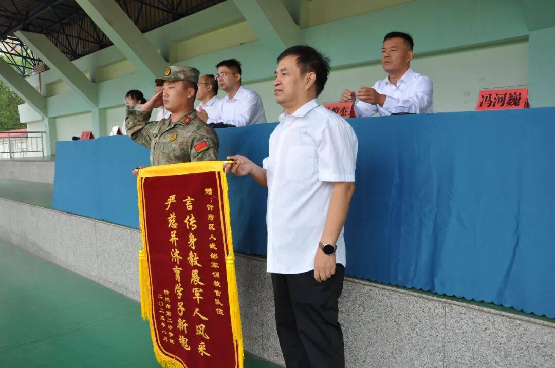校長助理梁成剛代表學校向區人武部軍訓教官隊伍贈送錦旗