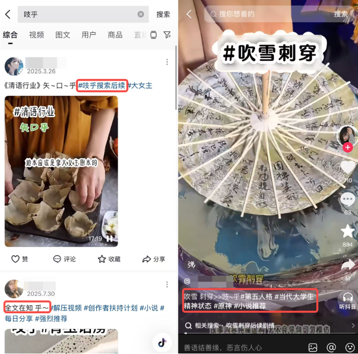 這些引流視頻往往採用解壓畫面,輔以AI人聲朗讀,在劇情進入高潮時戛然而止,提示你去知乎/吱乎/吱糊搜索後續,推流最狠的時段,你在小紅書、抖音、快手、微博等各大平台都能刷到。