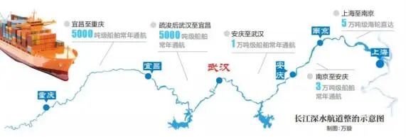 向下,武漢至安慶段航道整治工程也已竣工驗收,6米水深全線貫通,實現了即便在枯水期,萬噸貨輪也能直達武漢。