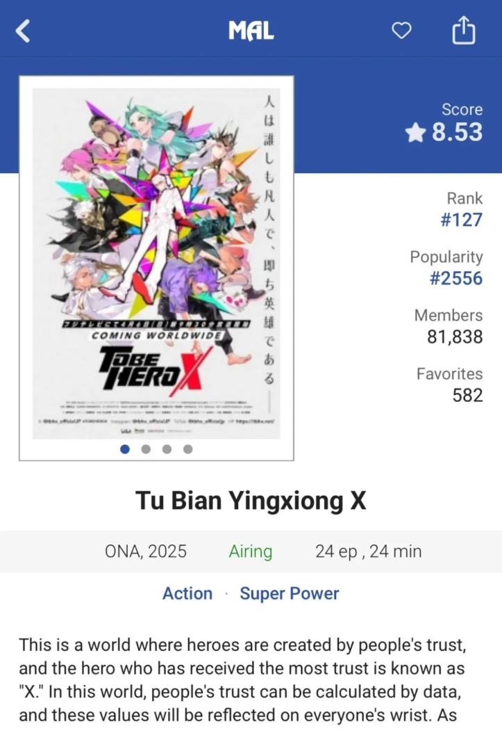 此次《凸變英雄X》,卻將國際化標籤消化得很好,動畫不僅在B站突破2億播放、吸引400萬用户追番,還在海外知名的動畫評分網站MyAnimeList上最高收穫8.53分,成為近兩年評分最高的中國原創動畫。