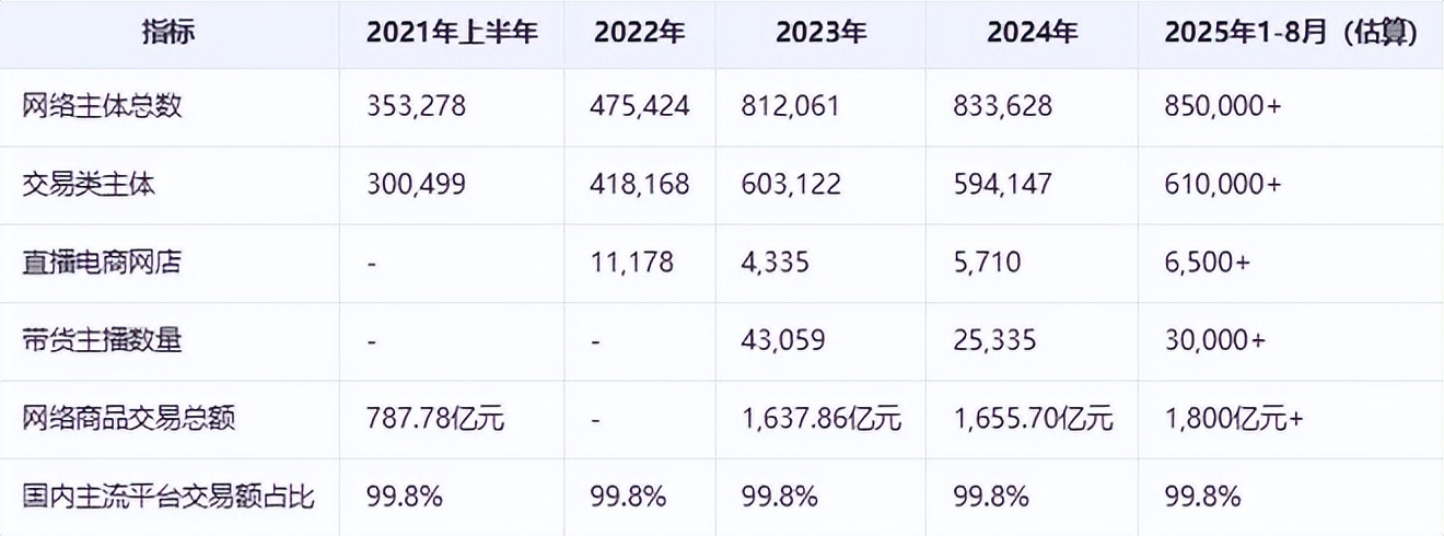 截至2025年8月,江西省已形成以南昌為核心、贛州為特色、多市協同發展的直播電商格局,擁有超過25萬帶貨主播、5700多家直播電商網店,2024年網絡商品交易總額達1655.7億元,其中直播電商貢獻顯著。(AI生成內容或存在偏差,內容僅供參考)
