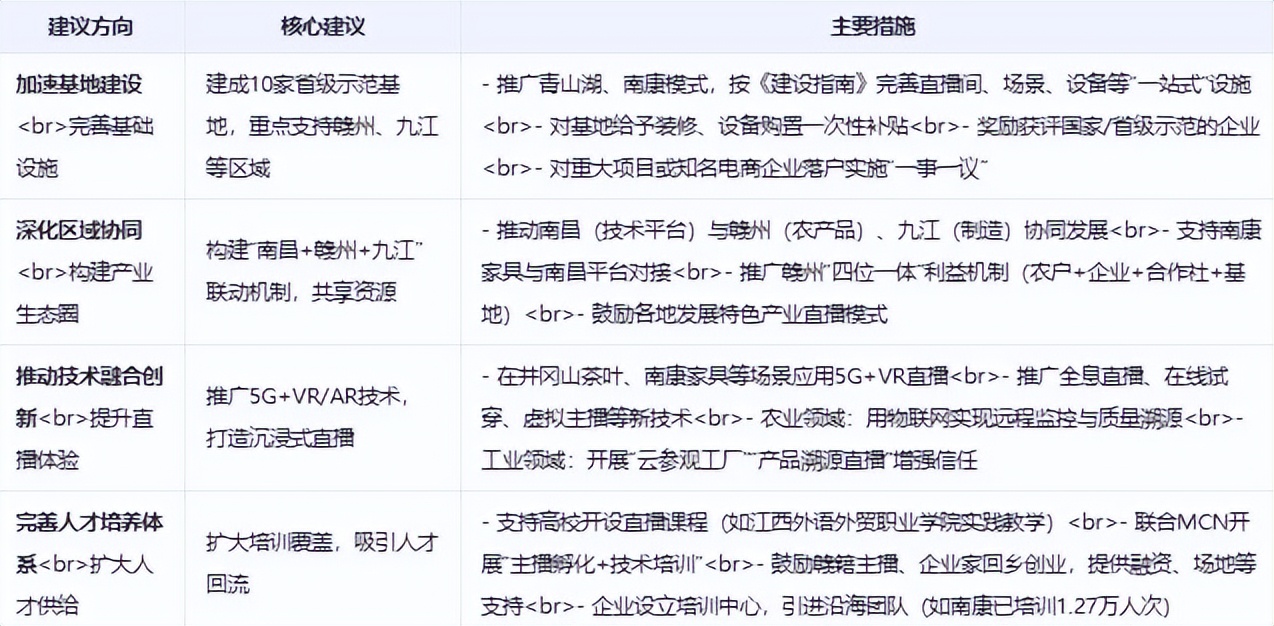 **措施:**推動南昌與贛州在直播電商領域的合作,如南康傢俱產業帶與南昌直播電商平台的對接;支持贛州市構建"種養+研發+生產+現代化營銷"模式,打造農户、電商企業、電商合作社、電商產業基地"四位一體"利益鏈接機制;鼓勵九江等設區市結合本地產業特點,發展特色直播電商模式。