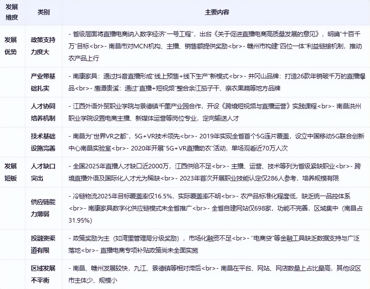 **政策支持力度大:**江西省將直播電商納入數字經濟"一號發展工程”,出台《關於促進直播電商高質量發展的意見》,明確"十百千萬"目標,並配套資金補助、税收優惠等政策措施。南昌市灣裏管理局對引進MCN機構、培育主播、直播銷售額等方面提供獎勵;贛州市構建"四位一體"利益鏈接機制,推動農產品上行。