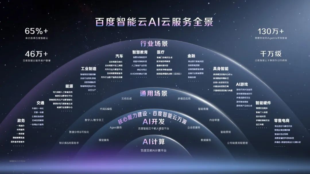 目前,百度智能雲已服務超 65% 的央企客户與 46 萬家企業,打造 130 萬個 Agents,成為中國 AI 產業系統化落地的核心支撐力量。