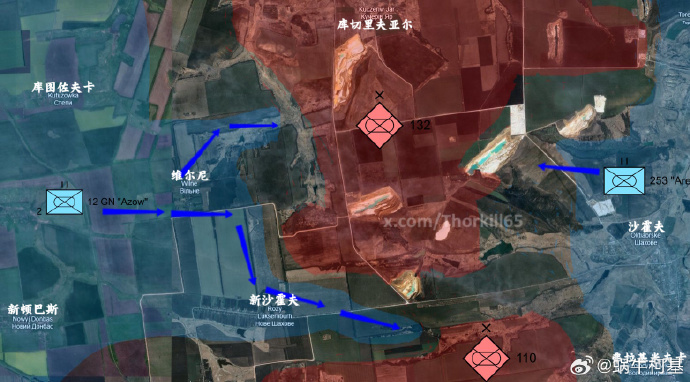 烏克蘭軍隊已在庫切裏夫亞爾地區包圍了俄軍,烏軍打通的這條約2公里寬的灰色地帶走廊沿着新沙霍夫-沙霍夫公路,目前處於烏克蘭軍隊的火力控制之下。同時,烏克蘭軍隊還正在維爾尼村北部向庫切裏夫亞爾方向發動進攻。近日,進攻該地的烏克蘭突擊小組已向東推進1.5公里,佔領了維爾尼東北郊的一處林帶(48.47803, 37.2338)及其以北的一處陣地(48.48652, 37.2302)。為了阻止烏軍的推進,俄軍近日已在那裏空投了約12枚FAB,但只是暫時阻擋了烏軍攻勢。另外,烏克蘭第253獨立突擊營再次沿着沙霍夫西北邊緣的林帶向其中一座粘土採石場(48.47674,37.3039)發起進攻。然而,這些攻擊似乎規模有限,旨在牽制俄軍。