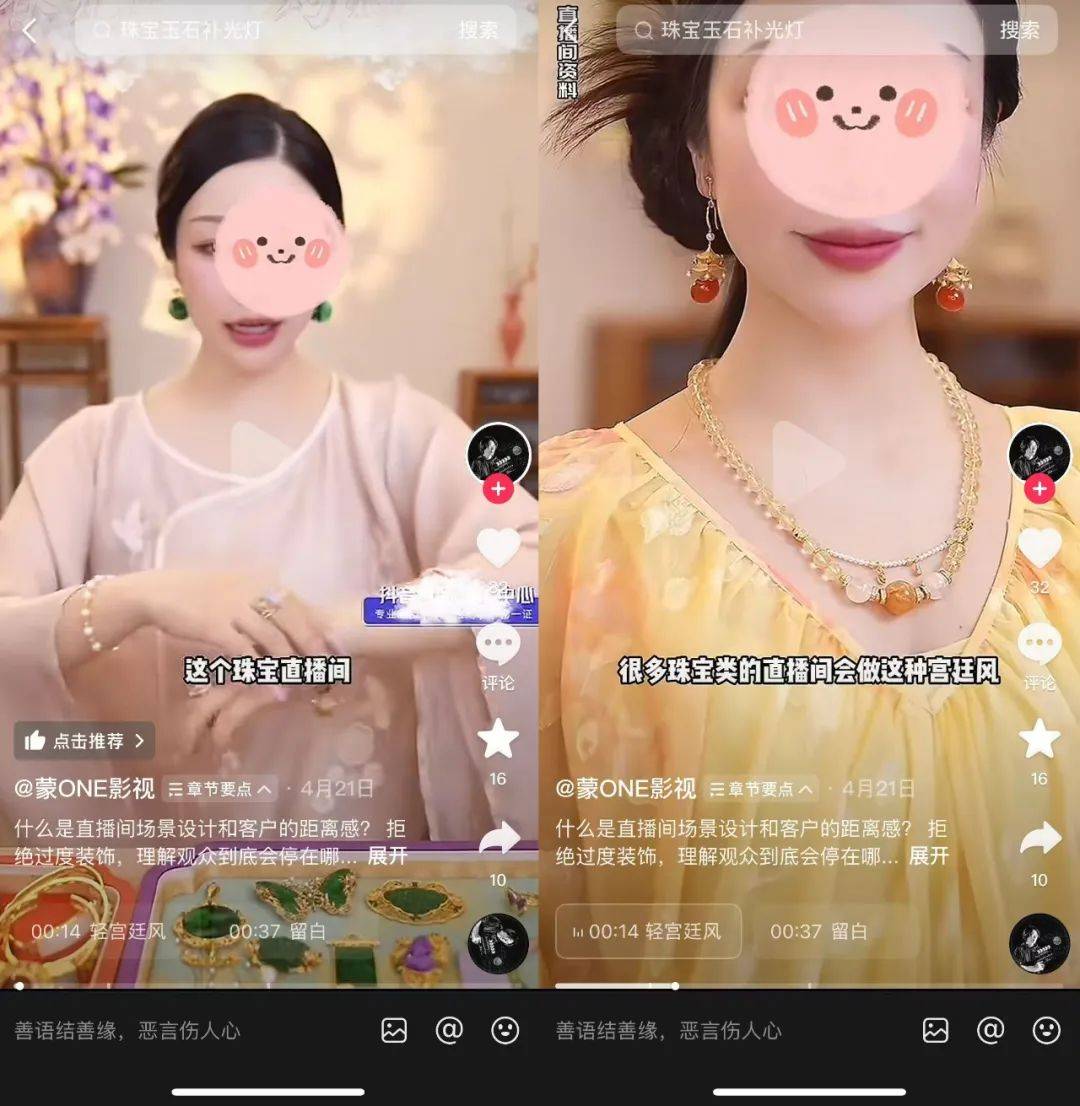 比如珠寶品類的直播間就已經逐漸拋棄了千篇一律的試戴展示,有商家直接把直播間改造成可以媲美橫店的宮廷場景,拉滿古裝國風的氛圍之後,再去講述每一件首飾的設計思路,把用户停留時長從行業平均的1.2分鐘拉到了4.1分鐘,流量和轉化率也雙雙暴漲。