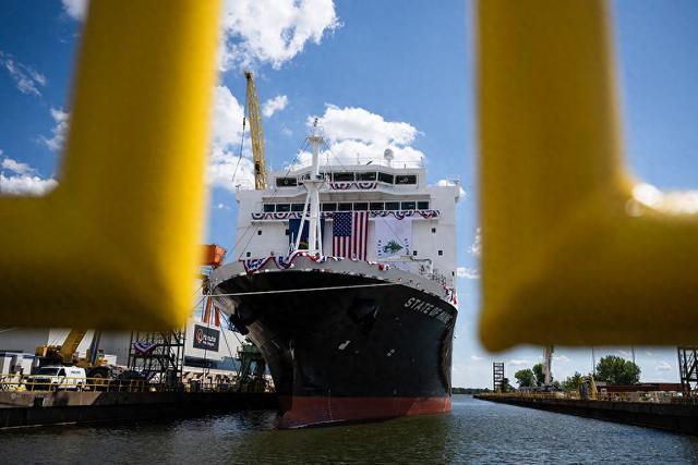 當地時間2025年8月26日,美國賓夕法尼亞州費城,韓華費城造船廠,“緬因州”號國家安全多任務船。視覺中國 圖 去年12月,韓國韓華集團收購了費城造船廠,承接美國海事局(MARAD)建造5艘國家安全多任務船的訂單。8月26日被命名的“緬因州”號是其中之一。韓華集團計劃投資50億美元,將費城造船廠的年產量從不到2艘提升到最多20艘。這被視為韓美造船合作的一塊重要試金石。