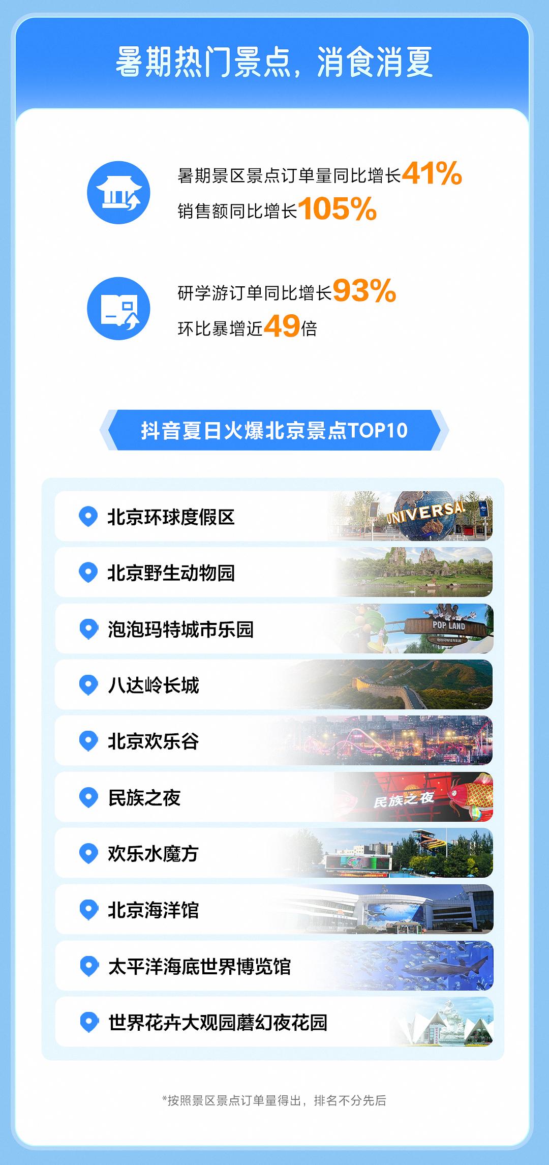 此外,暑期“北京遊”火熱。數據顯示,北京景區景點抖音團購訂單同比增長41%,銷售額同比增長105%。其中,研學遊團購訂單同比增長93%,環比暴增近49倍。北京環球度假區、北京野生動物園、泡泡瑪特城市樂園、八達嶺長城、北京海洋館、歡樂水魔方等入圍夏日火爆北京景點TOP10。