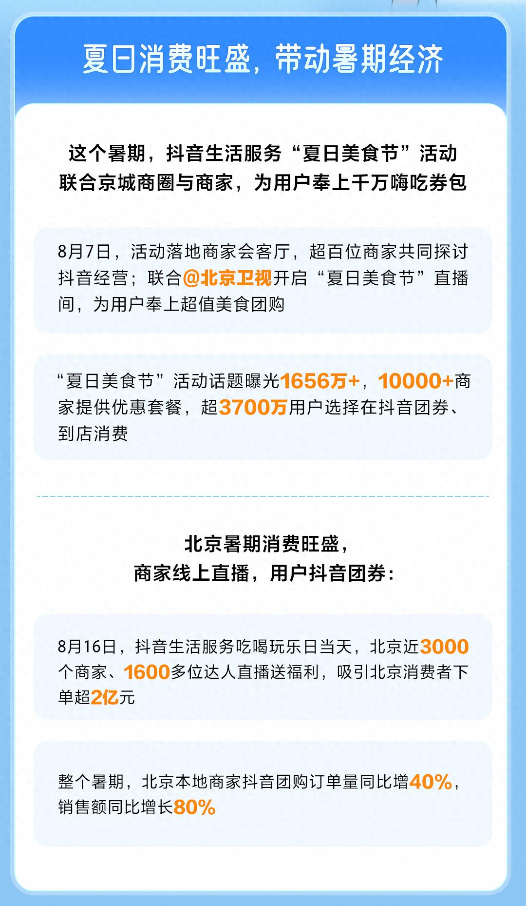 公開報道顯示,7月1日至8月31日,抖音生活服務發起北京“夏日美食節”活動,聯合北京多個商圈的餐飲商家,通過商圈大事件、千萬嗨吃券包等活動助力商家暑期經營,為用户提供海量嗨吃選擇,激發夏日消費。8月7日,在東城區商務局、東城區文旅局等指導下,活動邀請超百位商家見證“金街會客廳暨抖音生活服務東城夏日美食節啓動儀式”。