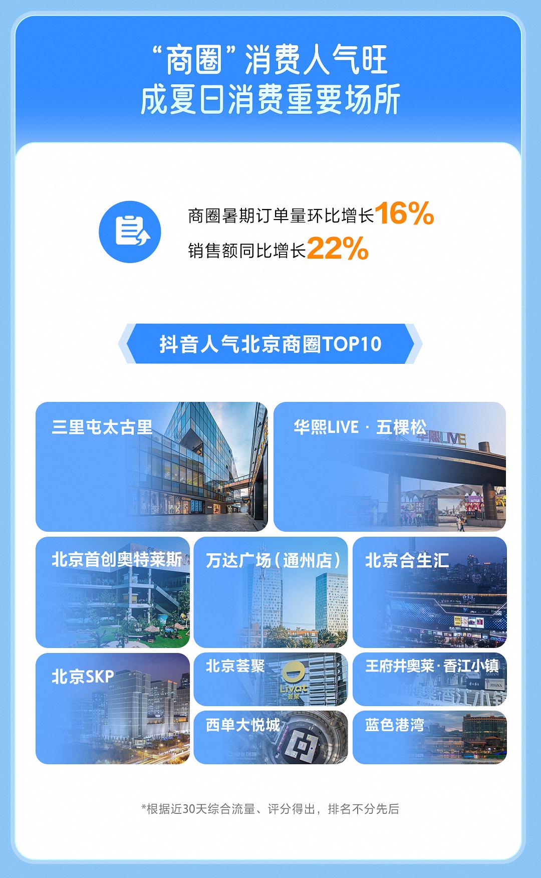 報告顯示,炎炎夏日,商圈成為很多家庭、情侶等人羣的消夏勝地。北京暑期商圈團購訂單環比增長16%,銷售額同比去年漲了22%。熱門商圈有三里屯太古里、華熙LIVE·五棵松、北京首創奧特萊斯、萬達廣場(通州店)、北京合生匯、藍色港灣、西單大悦城、北京薈聚等。快餐小吃、飲品、西餐、地方菜和火鍋成為火爆的美食品類。