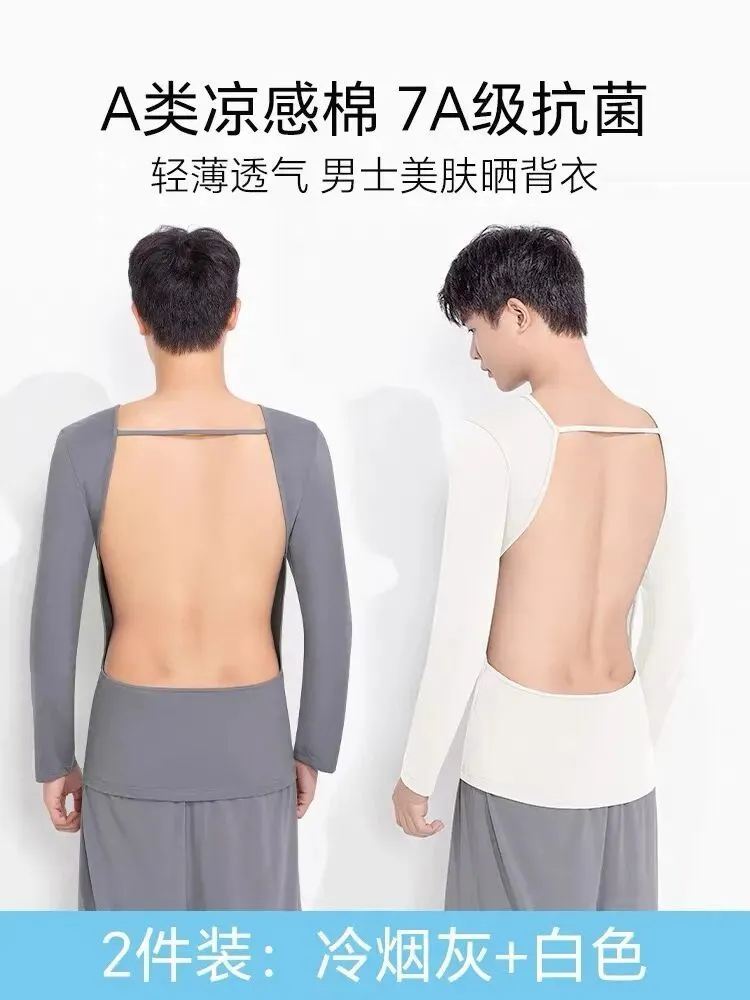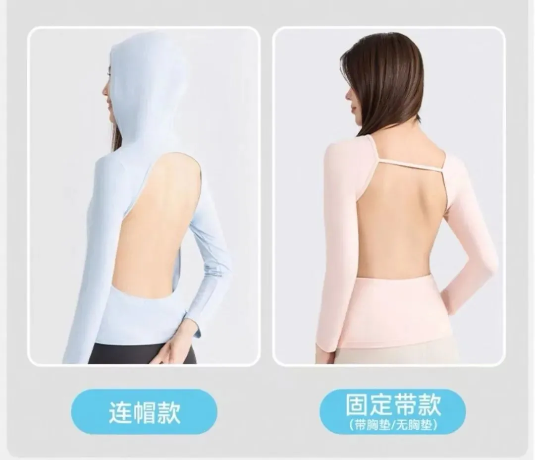 看上去,它不過是背上剪了個大洞的防曬衣,繫了根帶子的成人肚兜,能讓猛男秒變“萌男”的終極神器。連帽女款曬背裝,宣稱精準掏洞,可放馬尾,彈力合體,上身顯瘦,7A抑菌,觸感冰爽,自帶胸墊,半包下圍,防止走光,科學曬護,補足陽氣,“仙氣與陽氣兼得”。