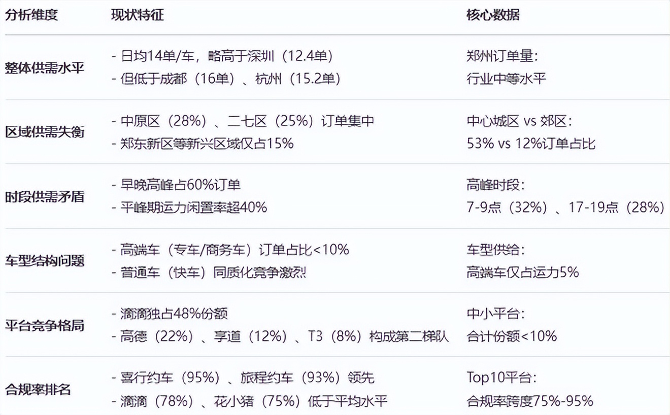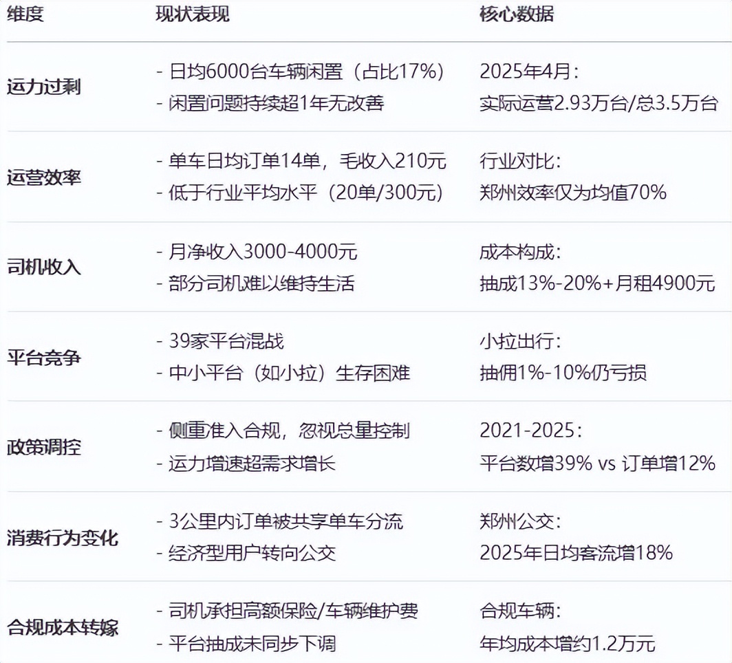 首先,**政策調控滯後於市場發展。**儘管鄭州市從2021年開始推進網約車合規化進程,但政策主要集中在准入標準和合規要求上,缺乏對運力總量的有效調控。在"適度有序發展"的政策框架下,平台數量和運力規模快速增長,而市場需求增長相對有限,導致供需失衡。