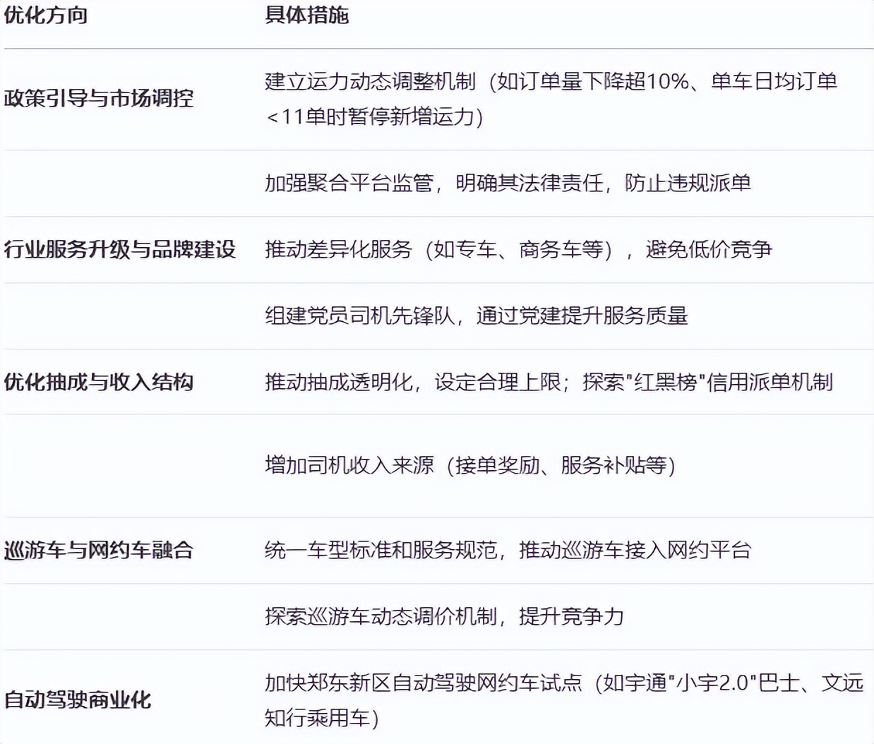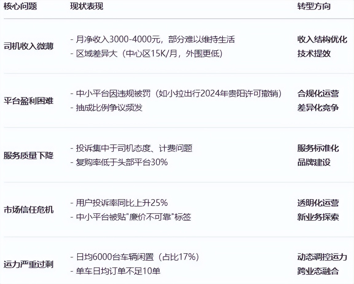 最後,**行業整合與轉型升級。**隨着市場飽和和政策收緊,行業將進入整合期,平台、司機和車輛都將面臨重新洗牌。同時,行業將從"規模競爭"轉向"價值競爭",市場競爭重點將從價格戰轉向服務質量、用户體驗和技術應用。