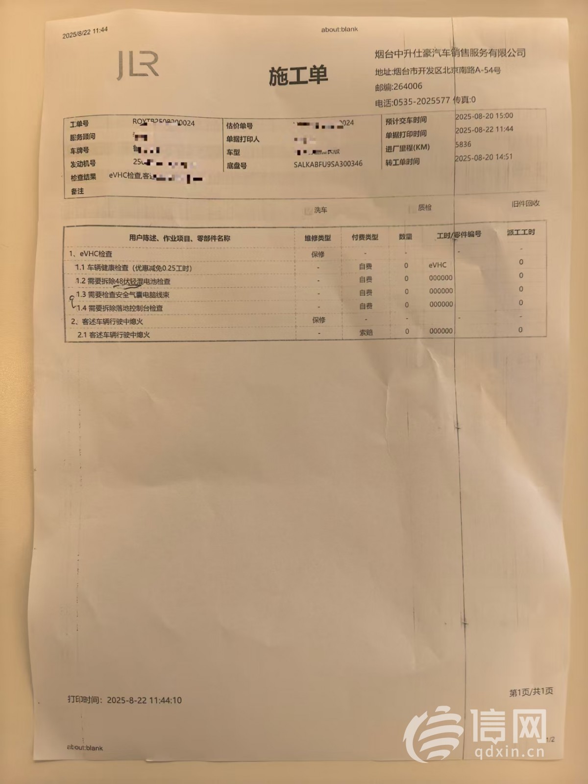 進店後的施工單。(來源:受訪者)信網8月28日訊一輛價值187萬的路虎新車,上路一個月報警提示有故障,還突然熄火。雖然每次等上一會兒車輛就能正常啓動,可馬先生還是不放心繼續開着這輛新車。他把車送回4S店,可想弄清楚故障原因就得拆車檢查,而一旦拆車留下維修記錄,勢必影響今後二手車交易時的價格,“是車先出的故障,現在拆解檢查的風險和損失都要我承擔,我不願意。”