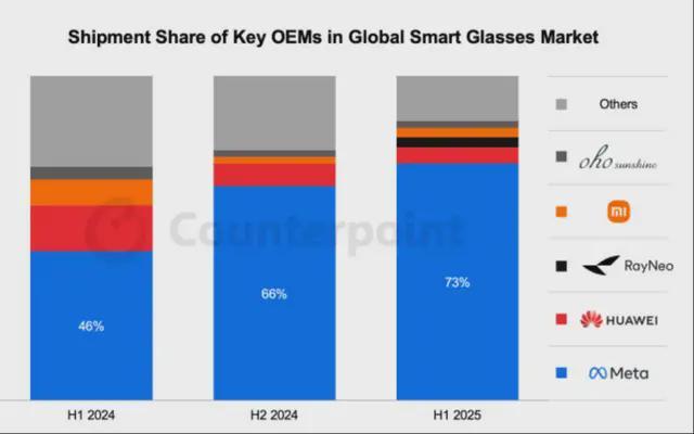 高通最大的AR1客户Meta,其在全球智能眼鏡市場的份額在今年上半年上升至73%。根據該市場研究公司本月早些時候發佈的一份報告,該市場規模與2024年同期相比增長了一倍以上。
