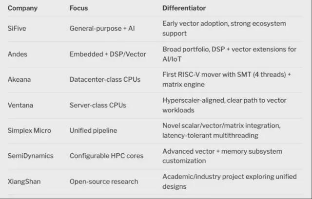 SiFive重點推出了支持Linux 和矢量的 RISC-V 內核,旨在滿足 HPC 和基礎設施的需求。晶心科技已擴展其內核,使其具備矢量和DSP功能,以實現嵌入式加速。Simplex Micro 正在開發一種統一的標量/矢量/矩陣架構,並配備可編程擴展功能,旨在覆蓋從邊緣到數據中心級的基礎設施解決方案。在研究層面,中國的“香山”已在同一個架構下進行標量和矢量統一的實驗。