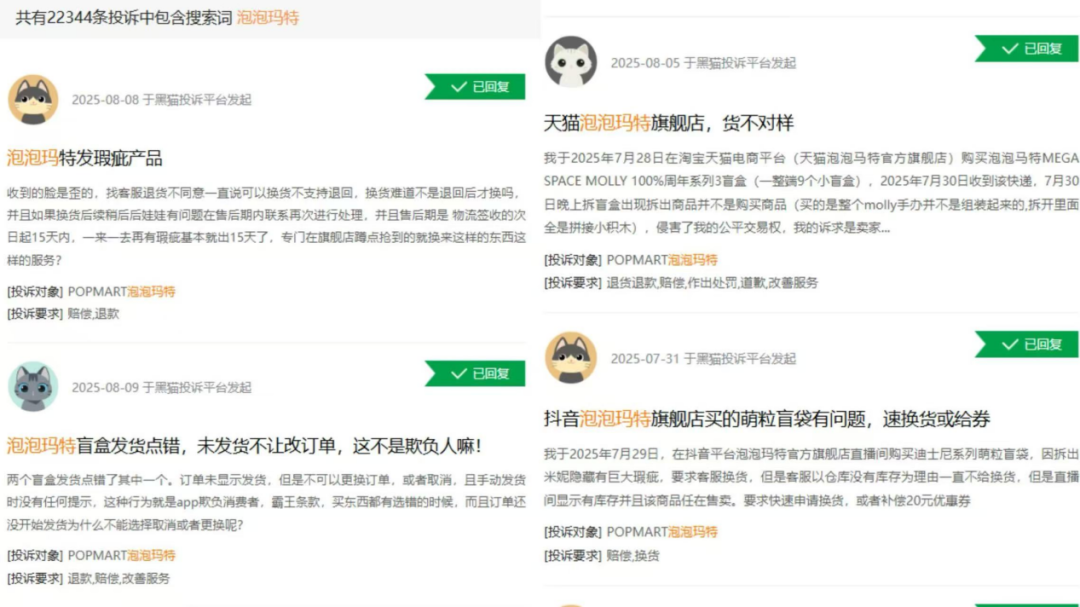 鋅刻度從黑貓投訴平台看到,關於泡泡瑪特的投訴多達22344條,其中大多涉及產品質量問題。今年火爆全球的LABUBU前方高能系列搪膠毛絨更是處處可見質量吐槽帖,不少消費者只能在多次換貨仍然收到瑕疵品的情況下選擇妥協。
