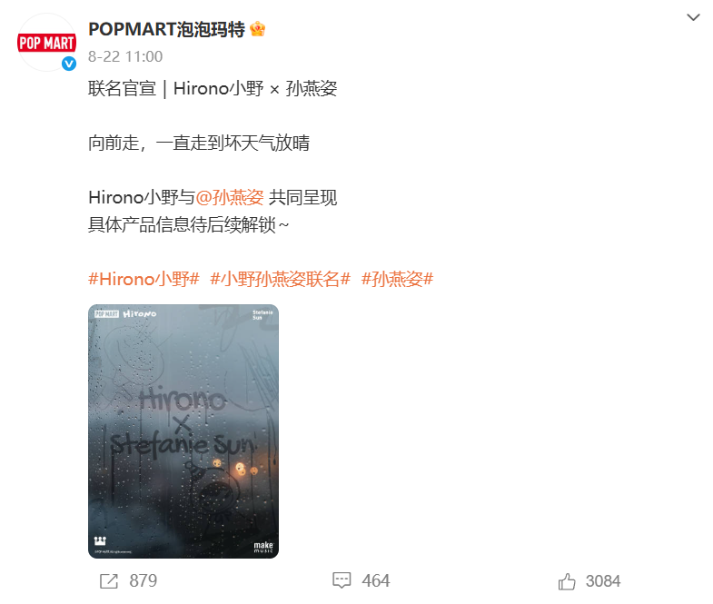 緊接着,泡泡瑪特又官宣與孫燕姿聯名,合作IP鎖定主打“情緒治癒”的Hirono 小野。官方發佈的海報以暗色調雨天為背景,玻璃窗上用白色筆跡寫着 “Hirono X Stefanie Sun”,下方配文“向前走,一直走到壞天氣放晴”。