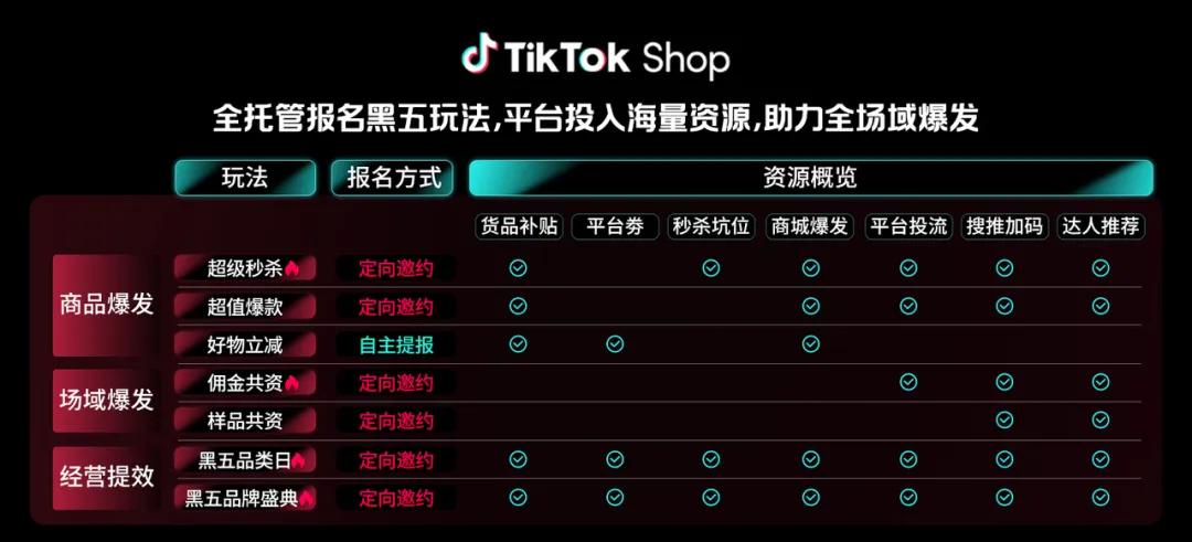 在此背景下,TikTok Shop全託管黑五商家大會帶來了更多的信心和明確的方向——黑五期間TikTok Shop將圍繞用户觸點全面覆蓋曝光資源,圍繞商品爆發、場域爆發以及經營提效三大維度進行玩法升級。在此基礎上,建議商家核心做好五個步驟:選好品備好貨、提升商品品質、維持價格有競爭力、積極參與內容場玩法、積極報名大促玩法。