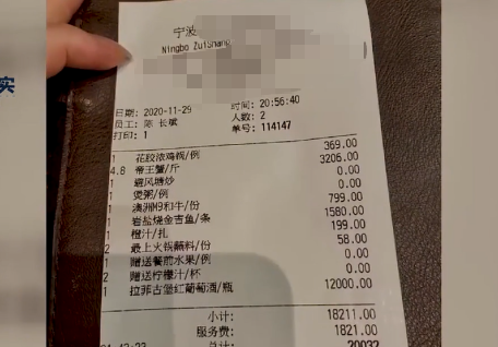 此時,賬單顯示,連菜帶酒加起來差不多兩萬元。