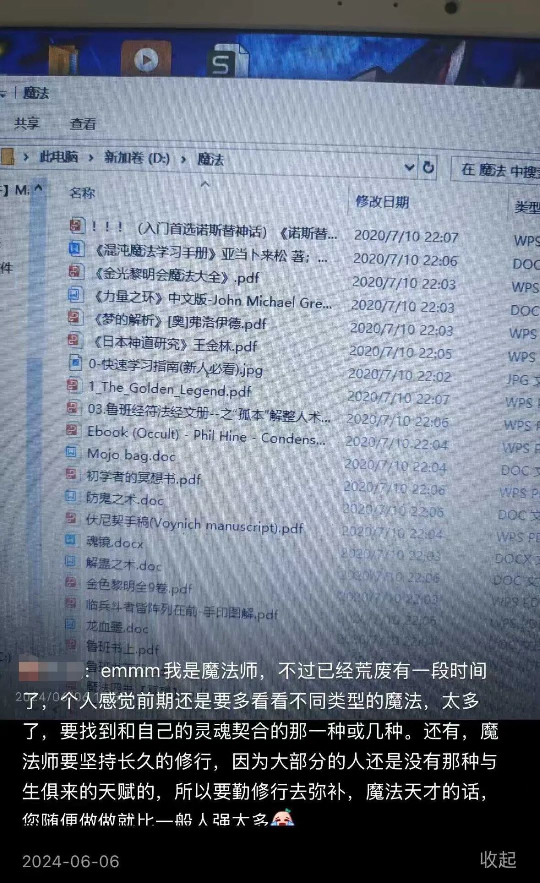 在小紅書、閒魚上,有人打包魔法書籍賣,9.9 元就能抱回一整套入門資料。熱心女巫推薦的“權威讀物”包括《魔法書大全》《魔法深化:給靈能巫者的術法課》《女巫的水晶魔法》和《巴克蘭巫術全集》等等。