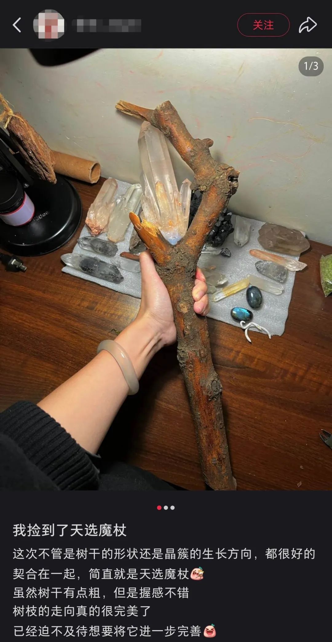 小紅書裏的女巫教學帖中,各路女巫和神秘學愛好者們紛紛分享了自己的經驗。有人曬出課程大綱般的清單:入門必備水晶、初學者友好的蠟燭種類、以及如何喚醒手邊的石頭;有人寫下心得體會,記錄第一次施法時的忐忑心情。