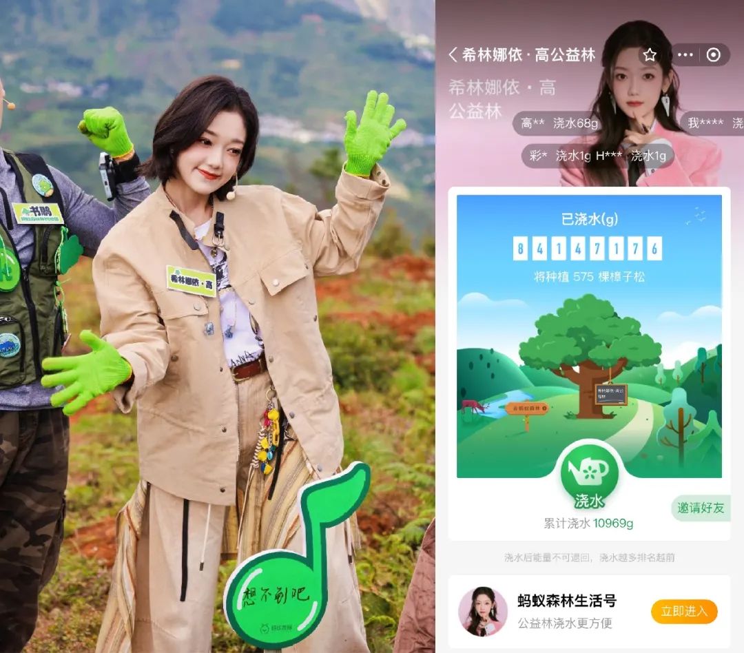 希林娜依·高在演唱會上官宣開啓螞蟻森林公益林之後,就有大批粉絲自發打卡澆水,用一次次的澆水點擊為希林“高能”應援。而她也用“親手種樹”的方式寵粉回饋:把虛擬能量變成了真實的小樹,把線上陪伴延伸到線下行動。這樣的互動,不僅讓粉絲收穫滿滿幸福感,也讓更多年輕人被吸引,加入到澆水種樹行列中,完成與偶像的雙向奔赴。