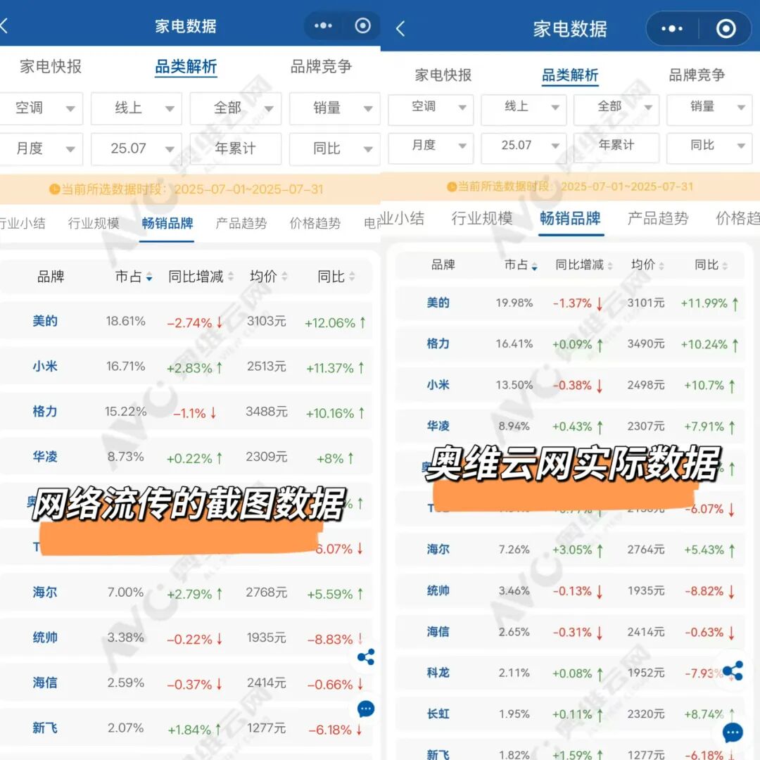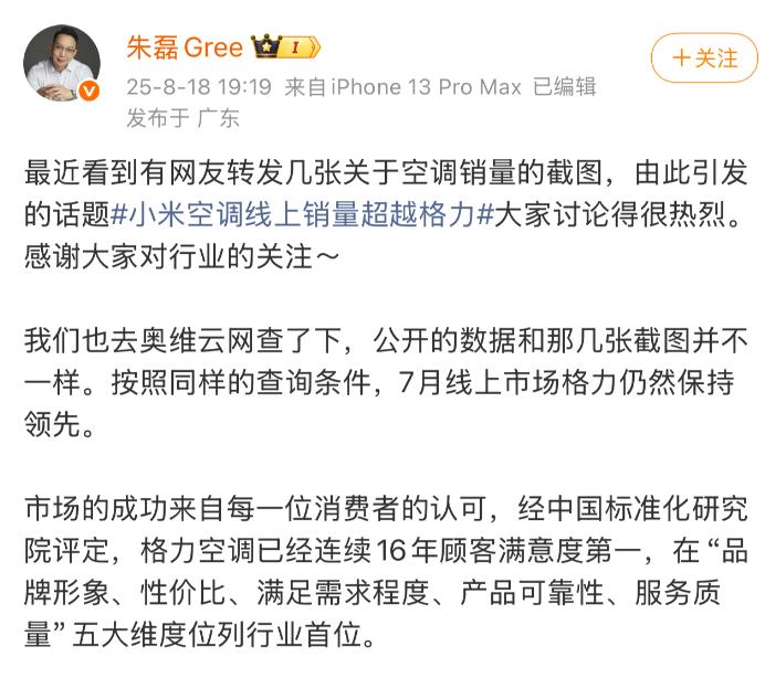 “7月線上市場份格力依然保持領先”。2025年8月18日,格力電器市場總監朱磊在微博上發文反擊,否認了小米空調7月線上銷量超越格力的説法。朱磊直言,格力去奧維雲網查詢顯示,公開的數據和小米的數據截圖並不一樣。