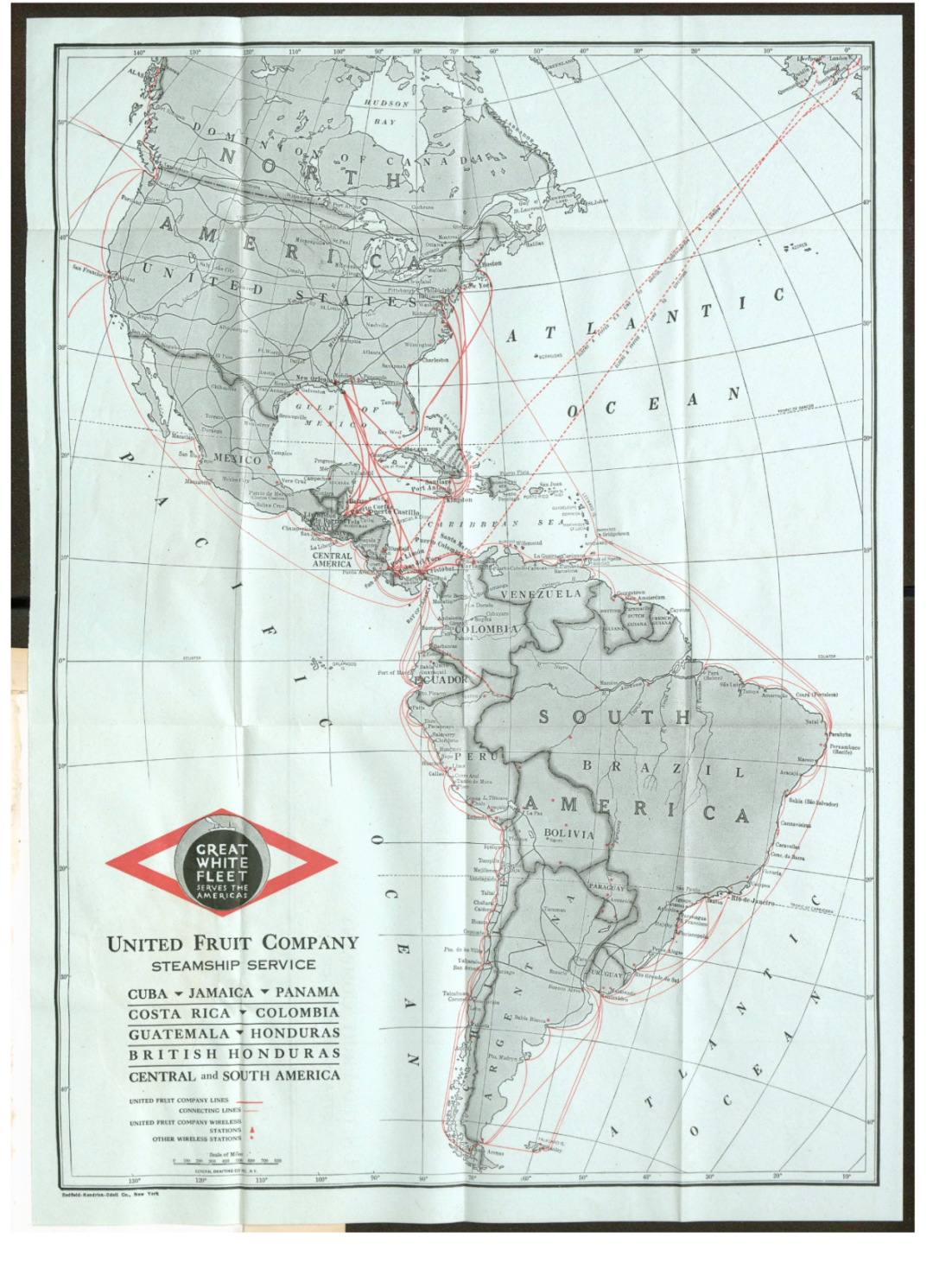 聯合果品公司這家背靠美國大山的巨頭,1899年橫空出世,迅速在中美洲織就了一張龐大的網絡。到1948年,它已在中美洲坐擁數十萬英畝的種植園、綿延數百里的鐵路和電車軌路,還有龐大的牲畜羣和遠洋艦隊。它不僅有自己的軍隊和法律,簡直就像個“國中之國”。也因為聯合果品公司就像章魚一樣,其觸手遍佈中美洲當地的政治、經濟、社會各個角落,所以也被當地人稱作是“綠色章魚”,觸角遍佈每一個角落。