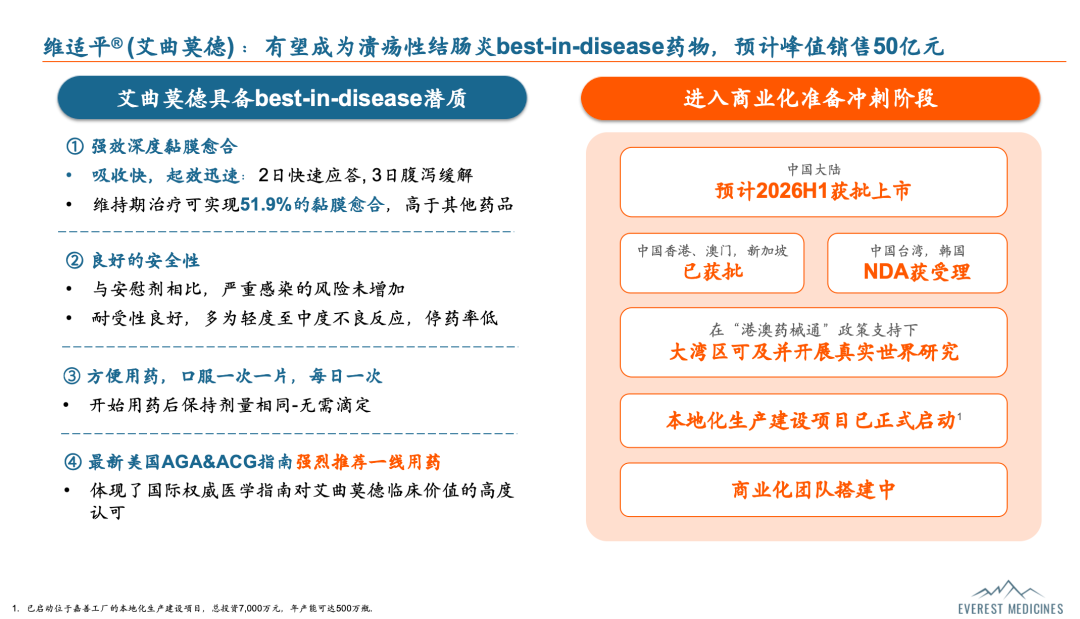 在中國,潰瘍性結腸炎(UC)患者預計到2030年將達到100萬人,市場空間巨大。艾曲莫德被納入2025版ACG指南並獲強烈推薦,進一步確立了其在活動性UC一線治療的地位。“大市場+強療效”的組合,奠定了其未來衝擊50億級大單品的高確定性。