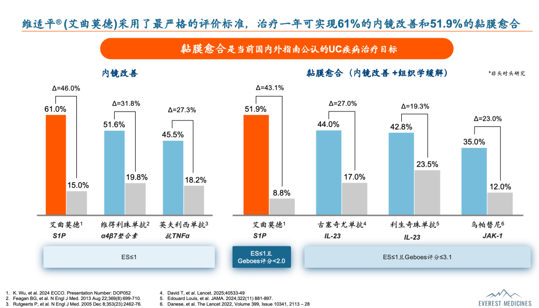 作為新型、高選擇性S1P調節劑,艾曲莫德以其快速的起效時間和深入的黏膜癒合效果脱穎而出。相比維得利珠單抗等生物製劑,其口服給藥方式更為便捷,並對經生物製劑治療失敗的患者依然有效。