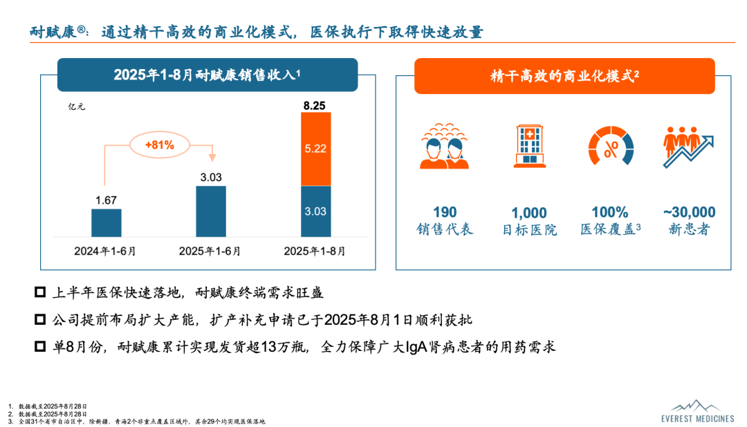 在銷售端,公司已圍繞耐賦康®搭建起完整銷售體系。到今年8月,腎科銷售團隊擴充至190人,目標醫院覆蓋1000家較去年同期幾近翻倍,並實現醫保全覆蓋,體現出公司高效的運營效率。銷售團隊的專業與渠道網絡,成為公司自我“造血”的關鍵。