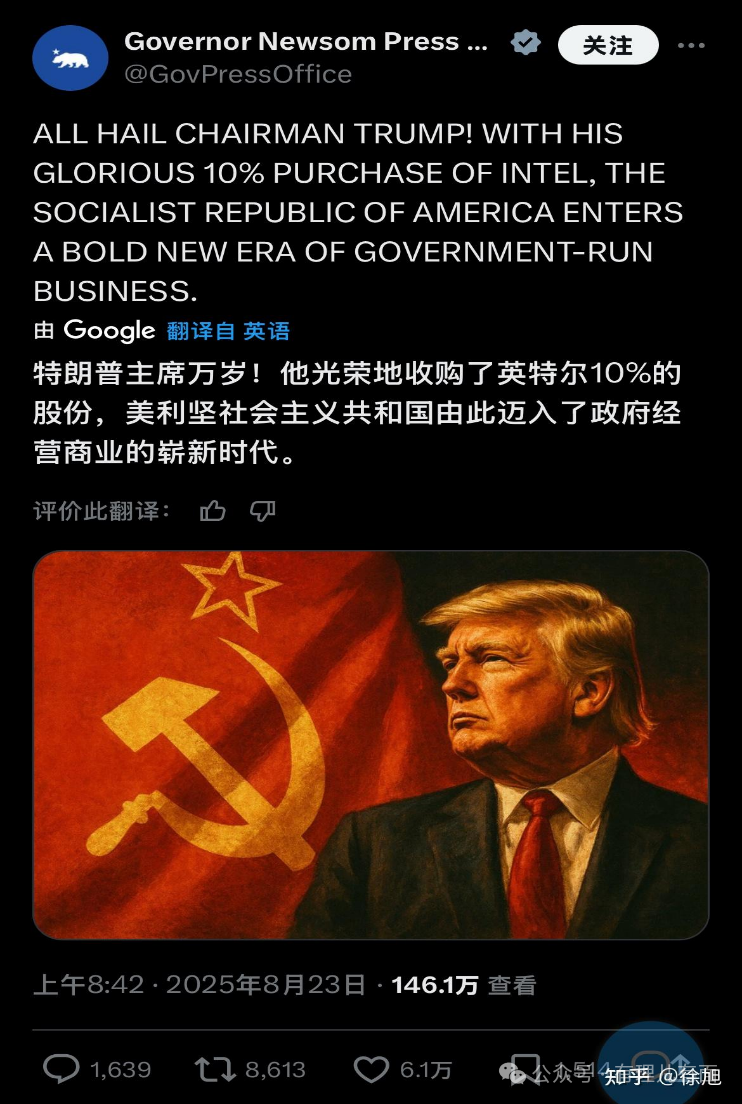 當然,這項行動早已是公開的秘密了,就在幾天前美國政府以約90億美元收購英特爾10%股份,特朗普為此吹噓:“我會整天為我們的國家做這樣的交易”,並將質疑者稱為“愚蠢的人”。