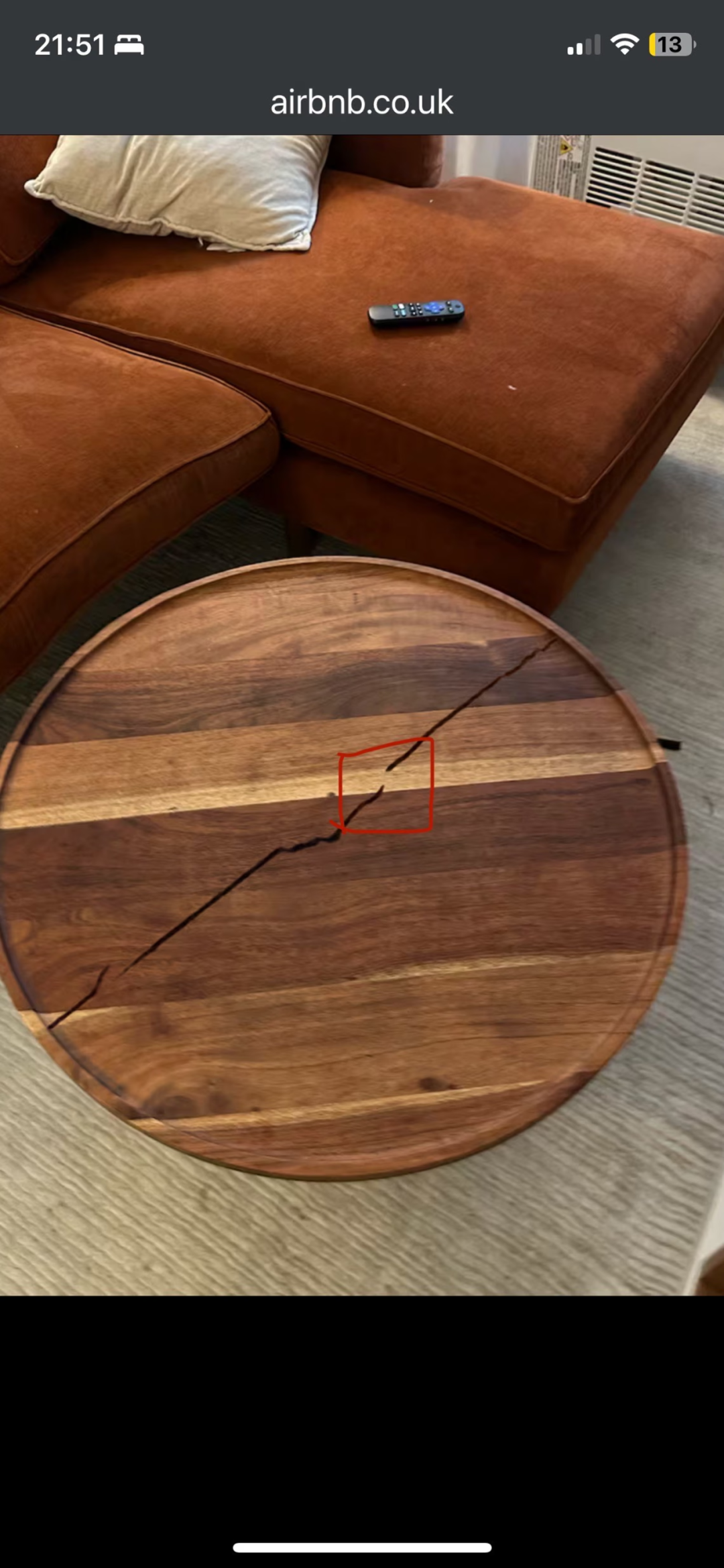 事情是這樣的,一個 Airbnb 的房東在租客退房之後,找平台哭訴。説自己價值連城的桌子被租客整爛了,裂開這麼大一道口子。